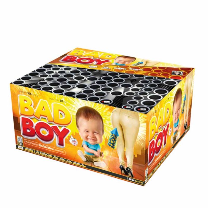Experience the spectacle of Bad Boy fireworks, a category 3 barrage with 106 multi-caliber shots and a variety of colourful effects lasting 80 seconds. With an 9 out of 10 noise rating, ensure a minimum safety distance of 25 meters. This firework is a complete display in a box.