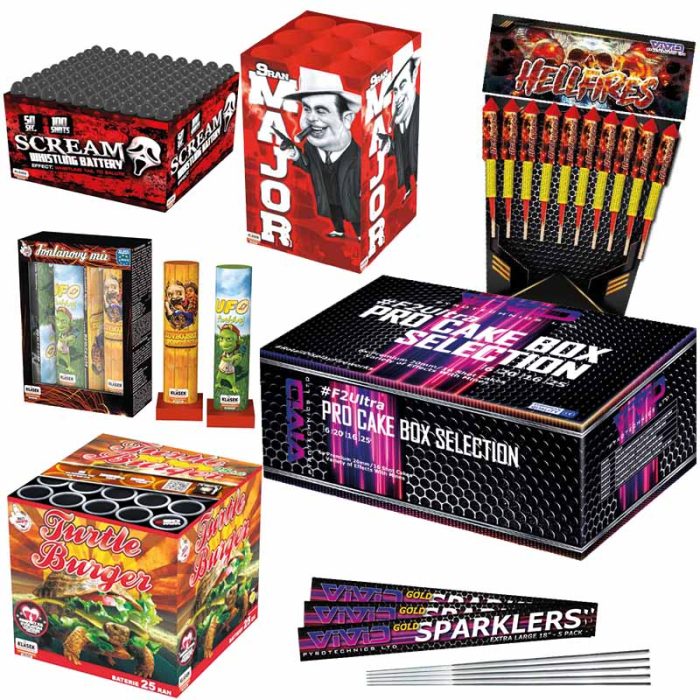 Introducing the “Galactic Firework Pack” – a delightful blend of captivating aerial spectacles and thrilling ground effects, carefully curated for the enjoyment of the entire family. This exceptional pack includes last year’s top-seller, the F2 Ultra Pro Cake Pack featuring six mine cakes with six different effects, four fountains, a dynamic 9-shot Major cake, a 100-shot missile cake, as well as a new addition of 10 rockets by Vivid Pyrotechnics. To enhance the sparkle, we’ve included 15 sparklers and an awe-inspiring 25-shot Turtle Burger barrage by Klasek Fireworks. This pack promises an unforgettable experience that caters to everyone’s entertainment desires.