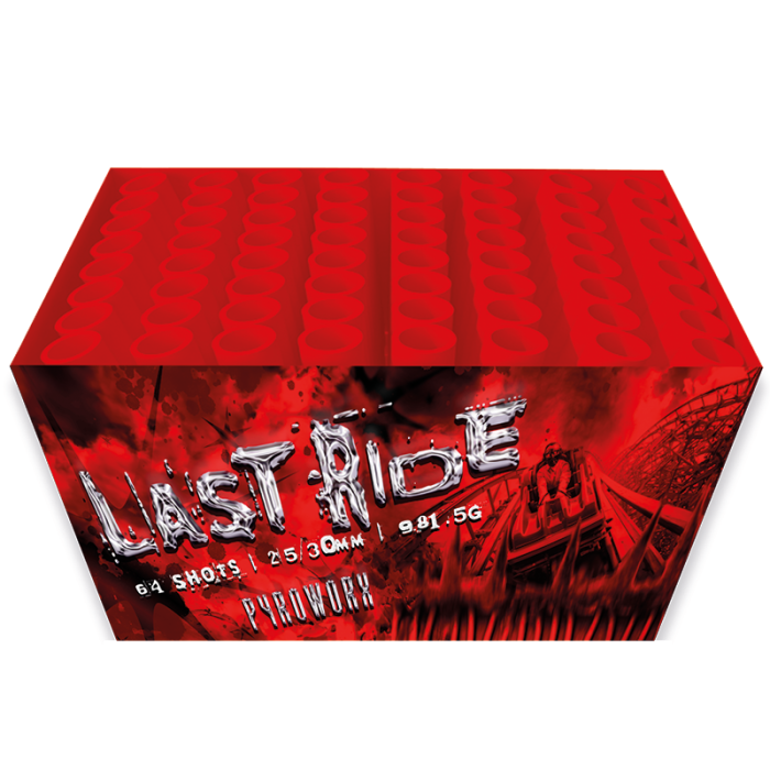 Get ready for an unforgettable display with the Last Ride, brand new for 2024! This multi-angled firework boasts 64 powerful shots, with a mix of straight and fanned effects. Featuring 980g of gunpowder, silver tails explode into stunning golden brocades and vibrant red stars, followed by brocades mixed with green, red, and silver peonies. The finale? A breathtaking volley of massive brocades that will leave everyone in awe. Perfect for any grand finale, this firework promises a show-stopping performance!