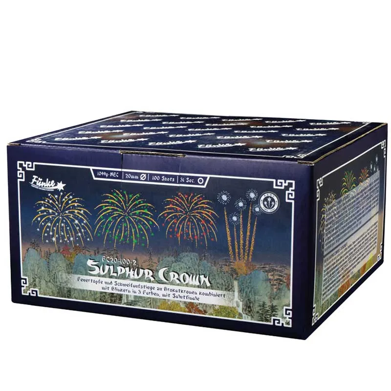 As the excitement escalates, the effects become larger and more resounding. Ultimately, the performance concludes with booming titanium salutes that provide a finale befitting any occasion. Featuring a robust 1099g NEC and 20mm calibre tubes, the Sulphur Crown is ideally suited for expansive gardens or open areas.